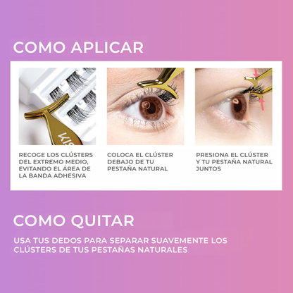 Las pestañas postizas Spiky de un solo paso SIN PEGAMENTO EXTRA con tecnología exclusiva de autoadhesión que se adhieren al instante y duran hasta 24 horas sin dañar las pestañas naturales. Pequeños CLUSTERS de pestañas postizas que se colocan debajo de tus pestañas naturales, de modo que las bandas son invisibles y el resultado es impecable.